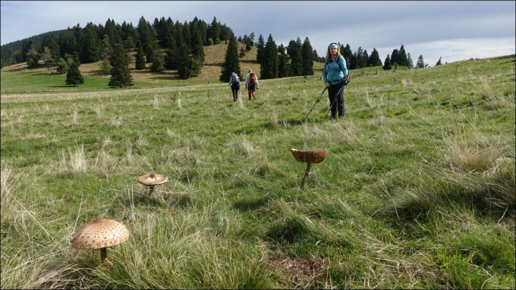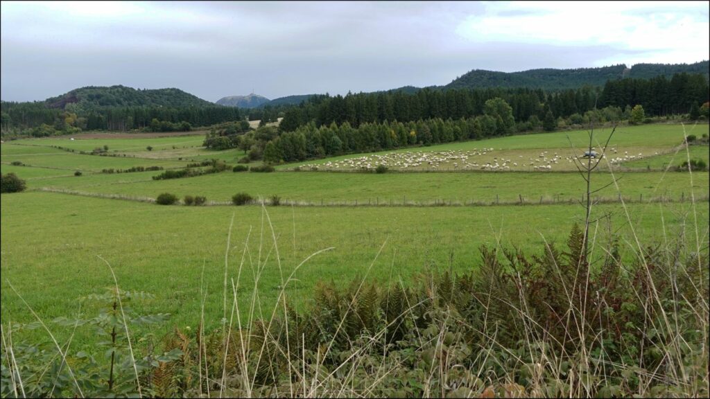 Les passages en sous-bois permettent à Pierrre en rando découverte de nous faire profiter de son expertise mycologique. Avec les conditions météorologiques de ces derniers jours, il y a eu de belles poussées. De fait, nous rencontrerons ici et là quelques porteurs de sacs en plastique…. Le passage à Récoleine nous apprend qu’un petit café derrière l’ancienne auberge de la Fourniale est encore ouvert. Quelques instants plus tard, nous nous arrêtons pour la pause déjeuner près de la petite chapelle qui domine le hameau. Le point de vue permet une belle lecture du paysage de ce petit secteur entre Dômes et Sancy.