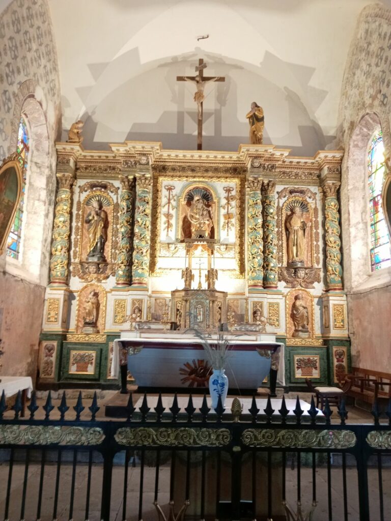 Belle boucle aux confins de l’Artense et du Sancy sous un soleil radieux et des couleurs de feu. En effet, dès l’approche par la route, les hêtres et les chênes couvrant les collines boisées depuis St Sauves prennent avec la lumière du soleil au Levant des teintes fauves et rougeoyantes. Nous partons de Tauves, bourg dynamique de l’ouest Sancy aux multiples commerces. Par des petites routes qui montent et descendent nous gagnons Noilhat et Mazérat. Les prés d’un vert intenses et peuplés de beaux troupeaux de Salers rajoutent aux couleurs déjà évoquées. Sur les points hauts de ce paysage de bocage, les monts du Cantal se dévoilent précisément sur toute leur longueur, du Plomb au puy Violent le plus à l’ouest. Bientôt nous rentrons dans Saint-Pardoux et sa belle église Romane des XI et XII siècle, transformée à de multiples reprises, orientée au nord et pas à l’est, ce qui n’est pas courant. D’emblée, ce sont les couleurs qui impressionnent : colonnes et murs sont peints, fruits d’un travail de restauration du milieu du XIXème siècle. Le grand retable doré au riche décor de végétaux impressionne lui aussi.