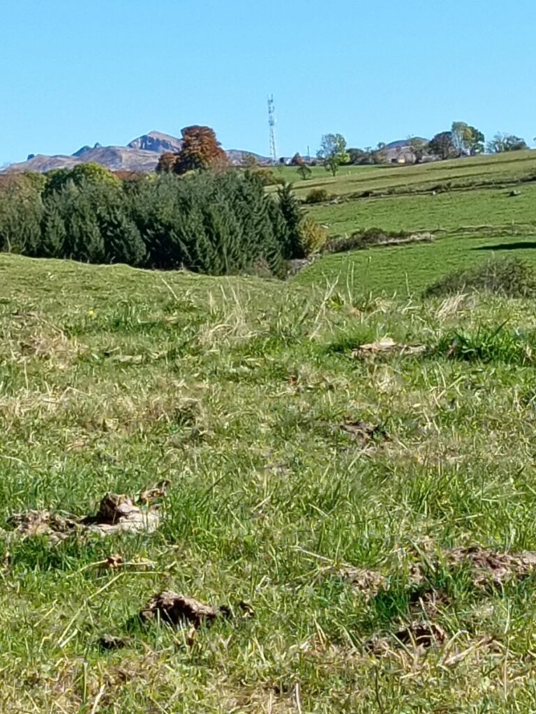 A noter en face de l’église, au fond du jardin d’une grande et belle demeure, autrefois colonie de vacances et magnifiquement restaurée depuis, on trouve une grande statue de ND de Natzy, sculptée dans de la pierre du Gard mais fragilisée par les intempéries elle fut rapidement remplacée fin XIXème par une statue en fonte haute de 6,50 m. Après ce hameau au riche passé, on tombe inévitablement sur la fameuse ville de la Tour d’Auvergne que nous abordons après avoir contourné son petit lac entouré par d’accueillantes berges engazonnées. Les branches ainée, cadette et puinée de la grande famille de la Tour d’Auvergne donnèrent naissance à travers différentes alliances à plusieurs grands personnages de l’Histoire comme Marie de Médicis, Henri de la Tour d’Auvergne dit Turenne le grand soldat de Louis XIV et Louis-Henri de la… qui fit construire le palais de l’Elysée au milieu du XVIIIème siècle. Le bourg fut bâti à l’origine autour d’un château-fort construit sur une butte basaltique dont on peut encore admirer les belles orgues très hautes et régulières. Pour y avoir séjourné quelques mois à l’hiver – printemps 2024, je confirme que c’est un bourg à l’architecture et à l’ambiance très austère. Le contraste en termes d’animation commerciale avec Tauves sa voisine est saisissant. Elle possède un beau marché le jeudi alors qu’il n’y en a pas à la Tour…. Le cheminement se poursuit dans la direction de la Stèle mais nous bifurquerons avant. Le sentier s’élève pour gagner le plateau. A l’heure du déjeuner, j’avais prévu de m’arrêter vers Sauzet sur un espace pique-nique. Las, un groupe de chasseurs occupe déjà le lieu. Nous nous arrêtons plus loin dans un beau pré de fauche au soleil, plein sud. Les pluies et la douceur ont favorisé de nouvelles pousses et la fauche vient d’avoir lieu, l’herbe sèche sous nos yeux. Nous entamons le retour peu après le repas. Nous traversons la forêt de la Montagne de la Roche et nous constatons la surface des coupes rases. Le prochain objectif de l’après-midi c’est d’atteindre la chapelle de ND de Natzy par l’est à l’opposé du chemin normal. Quelques passages de clôtures sont nécessaires afin d’éviter les troupeaux encore nombreux. Après un dernier effort dans une petite sapinière nous sommes au sommet de la colline sous la statue de ND de Natzy. Nous bénéficions là d’une vue à 360° : on touche presque du doigt ,à l’est, le massif du Sancy,