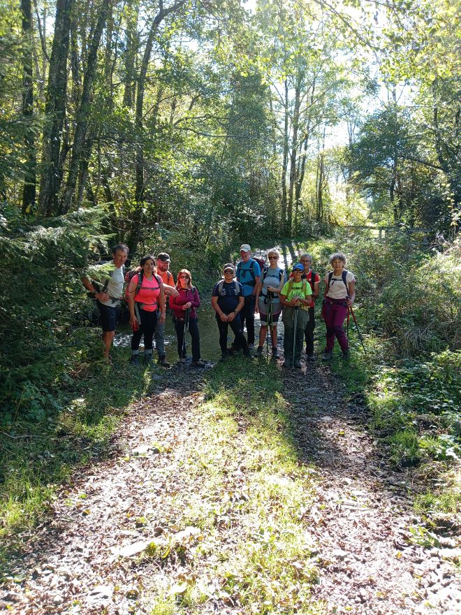 au sud les Monts du Cantal ne semblent pas si lointains et à l’ouest c’est la Corrèze et le plateau des Monédières avec en avant-plan la profonde échancrure de la vallée de la Dordogne à proximité de l’Ancien Prieuré Port-Dieu et du pont d’Arpiat. Nous repartons après un petit quatre-heures pour la dernière partie de la rando sur des petits chemins en sous-bois jusqu’à Mazérat déjà traversé à l’aller et Vassivières.