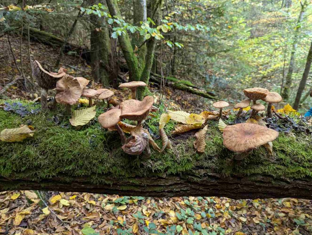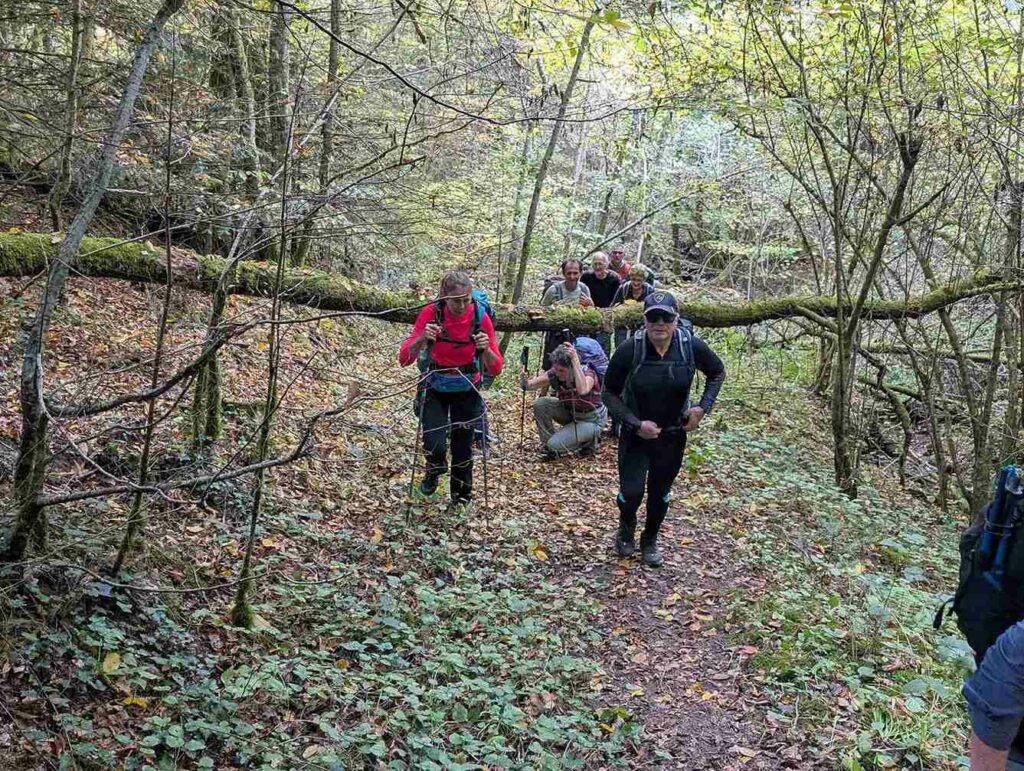 Puis nous remontons vers le grun du Perrier. Ce terme de « grun » tient son origine du patois « grounh », le groin du cochon, et utilisé avant la francisation pour désigner un monticule. Au Perrier, nous nous arrêtons pour le déjeuner dans un champ. Il souffle un peu de vent mais nous sommes relativement protégés par une haie. Les noms des hameaux traversés par la suite nous rappellent l’origine de leur nom en patois : La Chabanne (la Cabane), La Plagne (espace plat), Le Couderchet (petit pâturage mis en commun), Artheyre (lieu où on avait vu des ours) jusqu’à Brousse qui tire son nom de « buxerius » signifiant buis en latin.