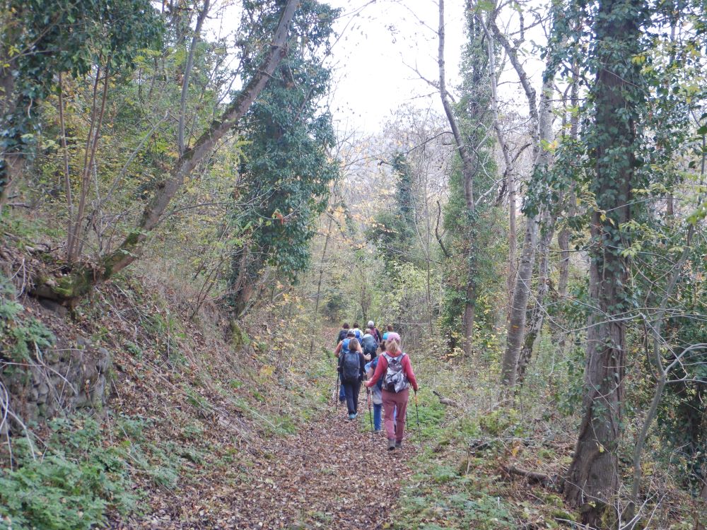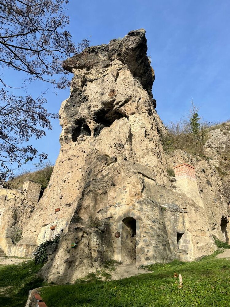 Des parties plus boisées pour descendre sur Perrier, et peu avant le village nous commençons à apercevoir à travers les arbres les premières falaises et cheminées de fée. Le village des Roches où nous arrivons ensuite est constitué de nombreux habitats troglodytiques qui furent habités dès le Moyen-Âge. Une vingtaine de familles y vivaient encore au 19ème siècle mais plus qu’une seule habitante en 1945.