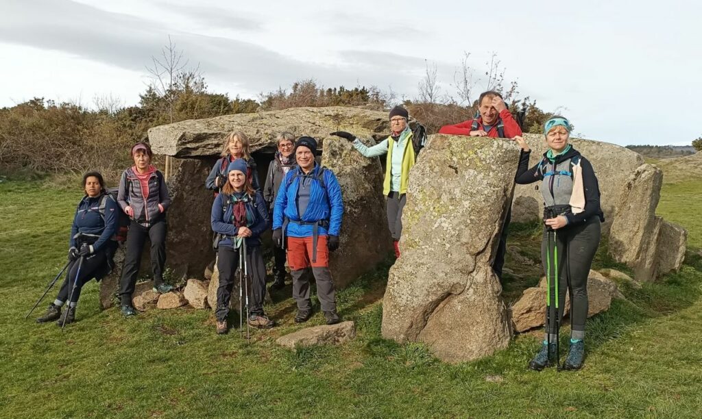 Remontée en hors sente au Puy d’Auzelle, très belles vues à 360°, passage à Olloix. Les jambes de certaines commencent à tourner au ralenti pour faire la dernière montée du jour par une sente très glissante et technique. A l’arrivée au sommet 1002m changement de température, bourrasques de vent, pluie et neige. Redescente coté Sud, puis chemin agricole pour retourner à Olloix, de là Puy de Marquerolle et chemin agricole, PC811,767,740, oppidum. Descente au ruisseau de la Monne et remontée, chemin forestier des crètes pour un retour aux voitures.