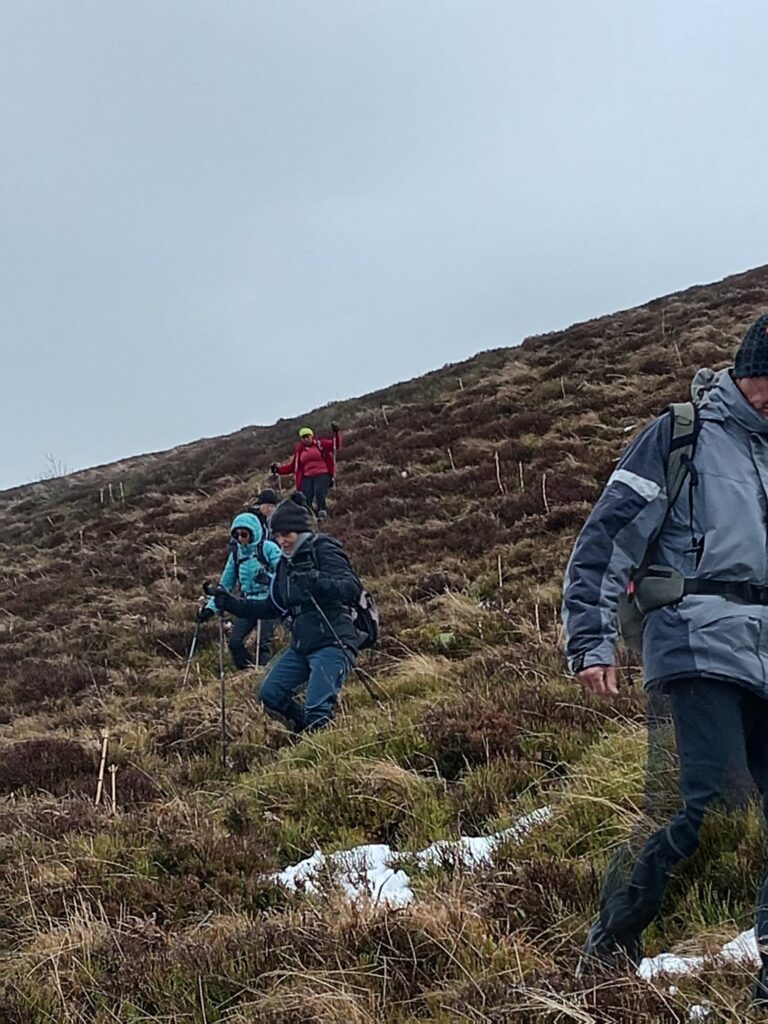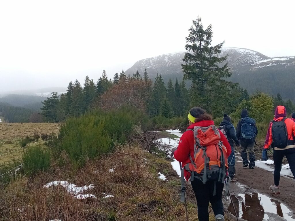 La pluie et le brouillard de ce frais dimanche matin suivant notre soirée d’AG n’ont pas dissuadé une petite poignée de courageux de partir randonner. Initialement prévue autour de Courbanges et Chaudefour et éventuellement à raquettes, la météo défavorable sur les hauteurs m’a fait choisir un départ à Mareuge pour une rando en partie forestière. Finalement la pluie cesse dès le début et seuls quelques flocons nous tomberont dessus au Baladou et à la descente de Monténard en fin de rando. Le plateau et la forêt au-dessus de Mareuge sont bien mouillés et les chemins d’exploitation bien boueux mais l’air est vivifiant et le petit groupe progresse bien. Un peu de lecture de paysage à la sortie des bois pour nommer les rochers de Sautet, les puys Chambon et de la Croix-Morand dont les sommets peinent à sortir de la brume comme le Baladou.