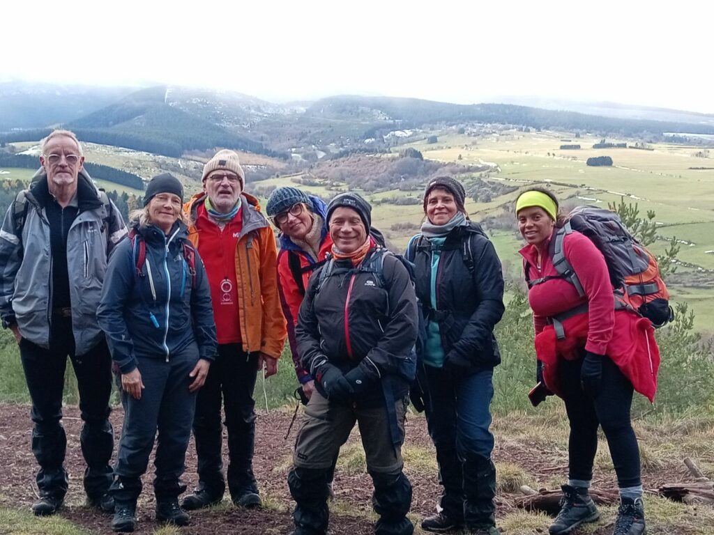 Le vent qui souffle un peu sur le plateau nous pousse vers les bois de Pessade où nous faisons la pause pique-nique confortablement assis sur des troncs couchés dans la neige. Du puy de Védrine, on envisage bien la suite de la boucle que je suis jusqu’à Mareuge. Tous les collègues ayant filé loin devant, sur le GR, je suis seul avec Philippe pour partager ces larges points de vue. Je ne l’avais jamais remarqué mais de ce point sur le GR on voit au NW le puy de Combe Perret évidemment mais également un tout petit morceau du lac de Servières que je n’avais jamais aperçu jusqu’alors 😊. Après Pessade, c’est la configuration de Saulzet qui m’étonne bien que souvent traversé : le village et ses maisons s’étirent sur une grande longueur et sur une orientation SW-NE qui lui vaut un bel ensoleillement. En haut du chemin d’exploitation qui descend vers le Labadeau, nous sommes quelques-uns à capter furtivement une petite scène domestique. Une petite fille est en train de faire des décorations de Noël et elle est multicolore, toute déguisée avec les guirlandes qu’elle va poser sur le sapin. Elle nous fait coucou mais tout étonnée que nous lui renvoyons son salut, elle se réfugie toute intimidée derrière une adulte 😊Charmant ! La fin de la rando approche mais comme il n’est pas trop tard, nous montons au sommet du puy de Monténard. Le sommet marqué par une belle borne géodésique est ouvert sur l’ouest ce qui autorise une belle photo de groupe avec le Creux et le bassin de Fonbtonne, le puy Baudet et le Baladou en arrière-plan comme un petit résumé de la journée.