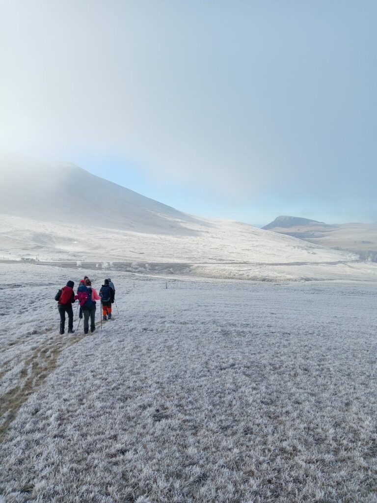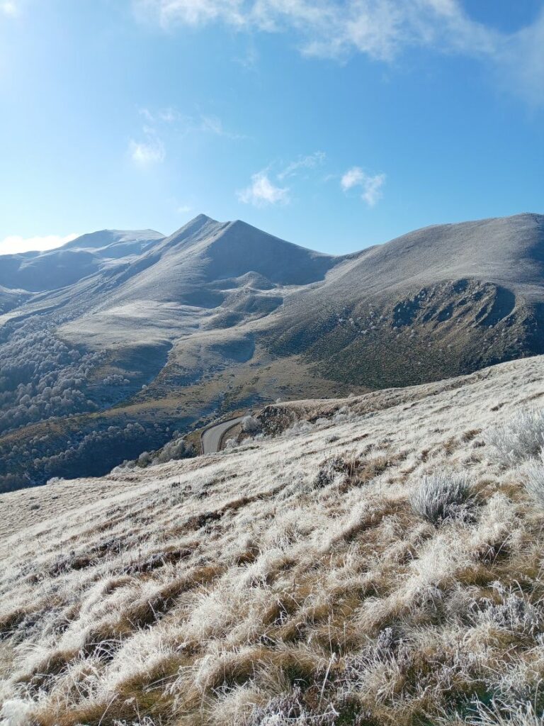 Sans trop d’à-coups, nous prenons de l’altitude jusqu’à parvenir sur les estives au nord du Puy de la Croix Morand. On devine à peine le Puy du Baladou au nord, grande et belle vigie prise dans la brume. Il est déjà midi et l’idée initiale d’aller retrouver le GR 4 pour atteindre le col ne me paraît plus judicieuse. Nous le gagnons en suivant au sud, le bas de la pente du puy. Dans l’herbe et les courtes bruyères, peu de risque de glissades même si toute la végétation est recouverte d’une belle pellicule de givre. Notre passage laisse un sillage vert dans toute cette blancheur.