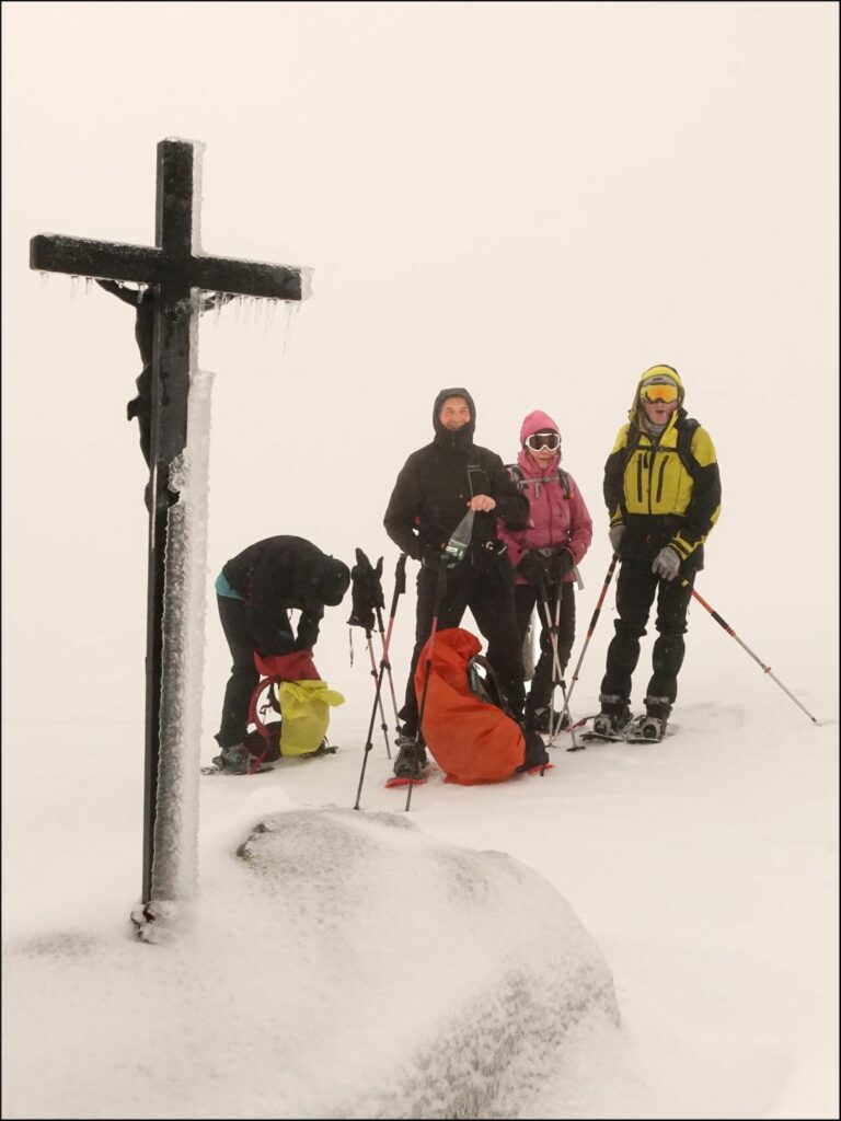 Après les directives de l’animateur, nous partons raquettes aux pieds dans 30/35 cm de neige humide en direction du Bois de Madalet, le cheminement hors pistes est physique pour les premiers de la colonne. A la sortie de bois nous prenons la direction de Landrode et nous voilà partis pour notre tour du Paillaret. L’isotherme à 1200 m monte avec notre progression, les flocons de neige se transforment en pluie /neige. Arrivés au Col de Couhay 1676m le vent et la pluie redoublent et nous prenons pleine face la dépression venant de l’ouest. Nous suivons comme main courante les pylônes du téléski de la liaison avec le Mont-Dore jusqu’à une cabane où, un skieur nous accueille lui aussi bien mouillé. Il est midi, nous prenons la décision de manger plus tard vu les conditions. Après avoir pris une boisson chaude tirée du sac, nous repartons bien mouillés. Cap Col de la Geneste dans les conditions les plus terribles pour un randonneur, jour blanc, aucune vision, et trempés. Le groupe est à rude épreuve mais ne panique pas. Comme je fais quand les conditions de navigation et météo sont difficiles, j’envoie la trace GPX à quelques adhérents qui ont les appareils compatibles. Aujourd’hui, dans ces très mauvaises conditions, j’ai donné les éléments à Pascal qui, avec sa montre au poignée avait plus de facilité à suivre la trace que moi avec mon téléphone. Arrivée au Col de la Geneste, nous ralentissons notre cadence à travers le bois de hêtres et retour sur la station.