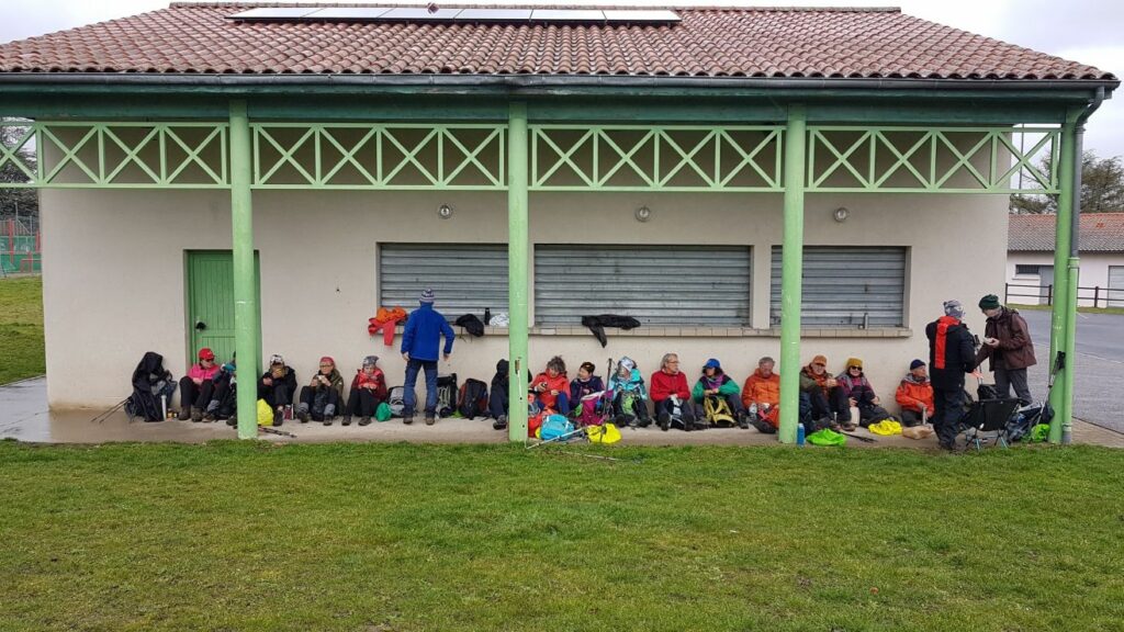 Dans la descente la pluie cesse et face à nous plein nord, un carré de ciel bleu apparait ce qui nous redonne l’espoir d’une amélioration. Après avoir traversé la nationale, en direction de Beauregard-l’Evêque quelques gouttes réapparaissent. Dans le village, nous découvrons étonnés, la seule maison à pans de bois, et nous nous mettons à la recherche d’un abri pour le pique-nique. A proximité de l’école une avancée d’un bâtiment public est approuvée par tous.