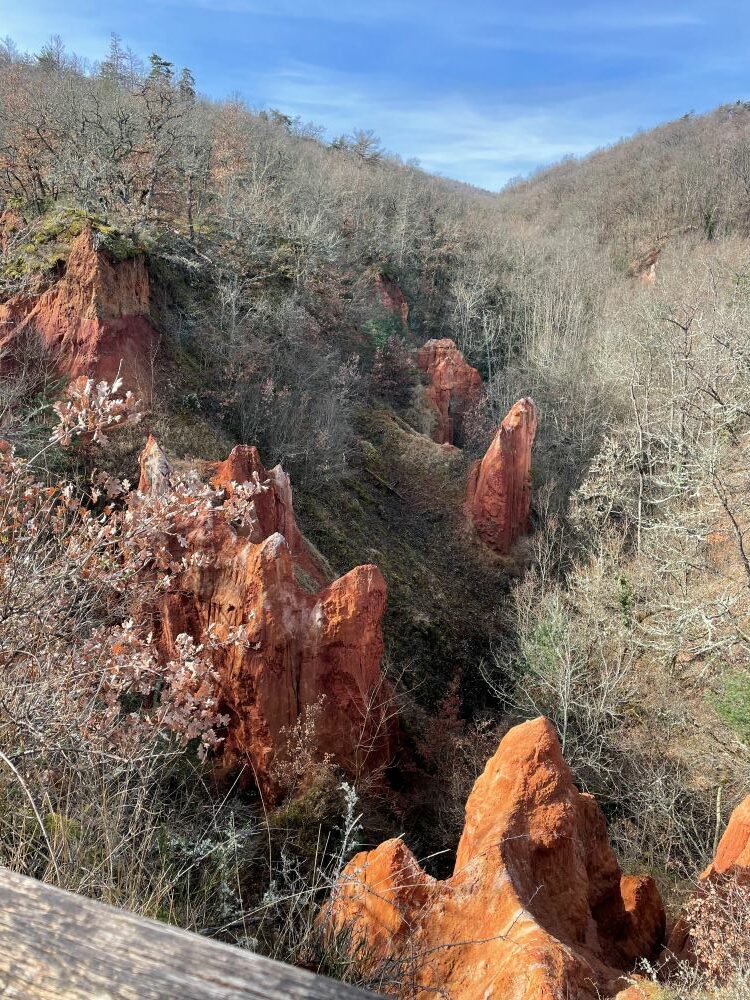 L’église Saint-Loup dont les parties les plus anciennes datent du XIIème siècle, bien cachée au centre du village, ne se visite plus en raison de la précarité de l’édifice et une souscription a été ouverte pour aider au financement de sa restauration. Le village étant niché au bord du Couzillou, nous remontons sur les coteaux pour arriver à la Vallée des Saints. Dans le groupe d’aujourd’hui toutes et tous l’ont déjà parcourue mais c’est toujours avec plaisir que l’on retrouve ses couleurs ocres et ses cheminées de fées.
