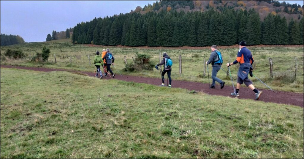 La barrière montagneuse des Dômes et Sancy en toile de fond, bleutée ce matin s’assombrit brusquement. Le vent se lève et quelques gouttes arrivent. Contemplation succincte des lieux et nous redescendons rapidement sur Egliseneuve.